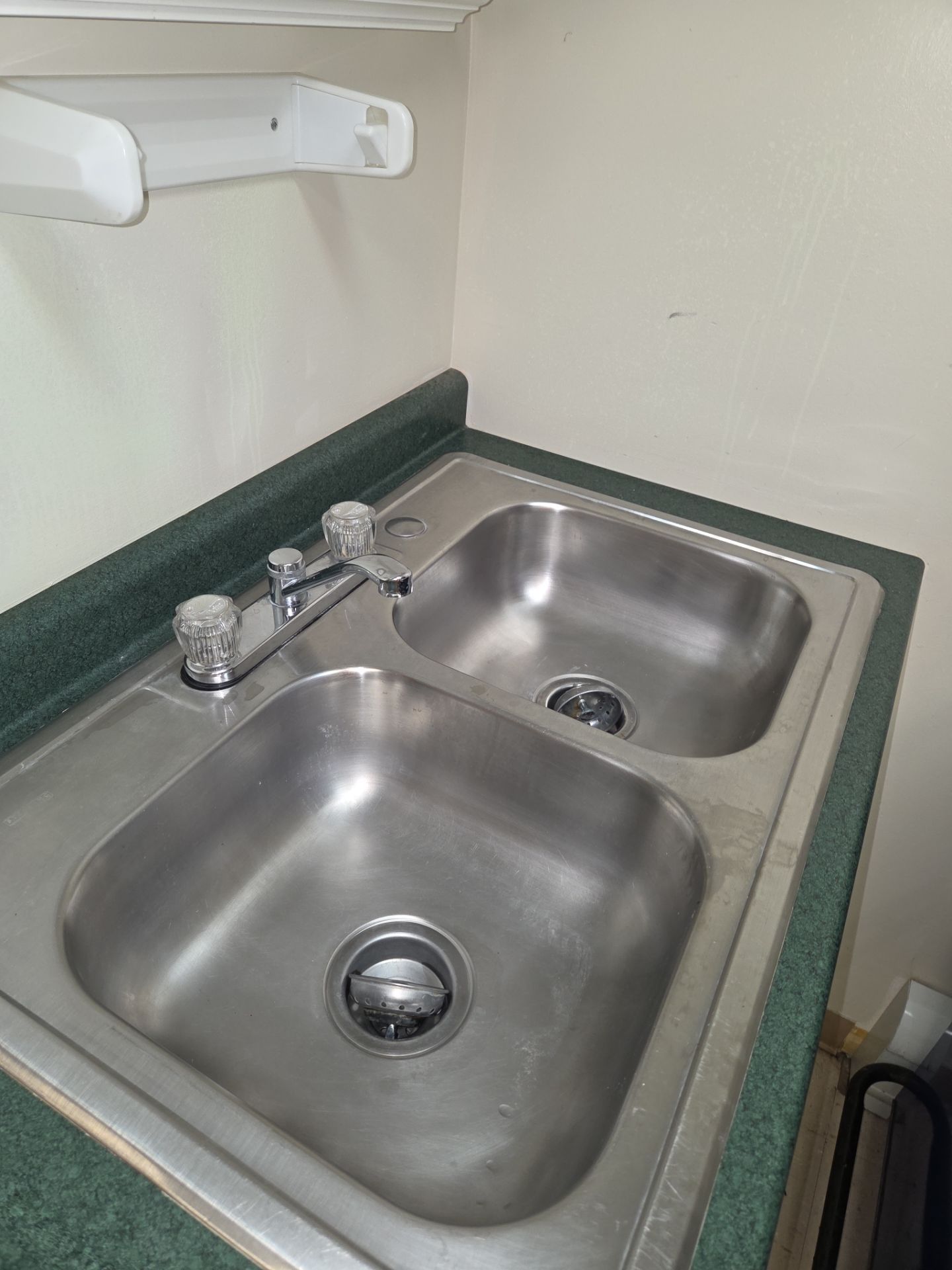 This is a nurse's office in the building, and everything, from top to bottom, was disinfected. The stainless steel sink is shining like new.