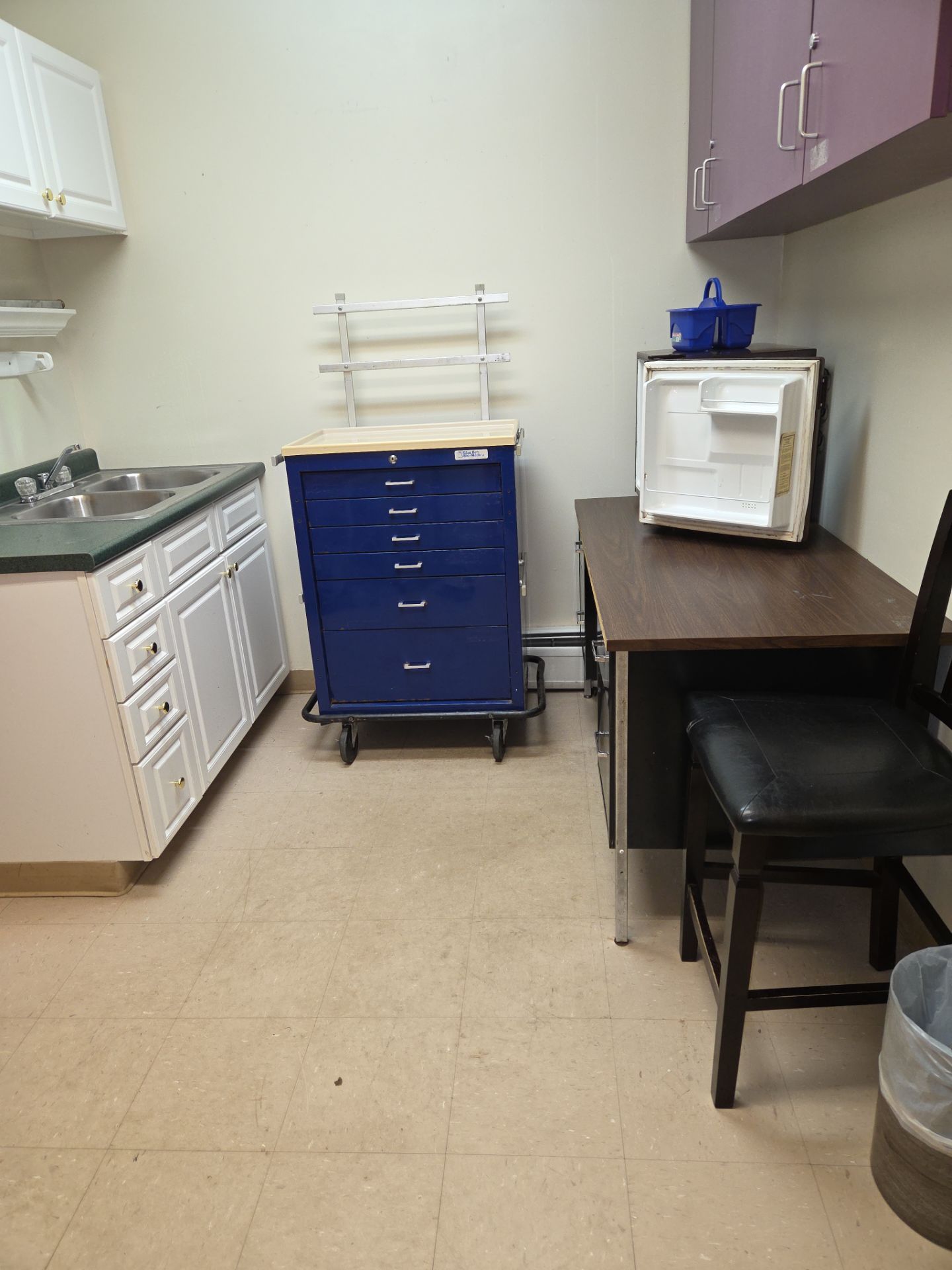 Finishing the nurses' office by disinfecting the area top to bottom, including inside cabinets and inside the medical fridge.